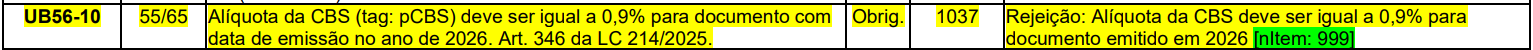 A partir das regras estabelecidas pela Nota Técnica 2025.002, as notas fiscais (NF‑e modelo 55 e NFC‑e modelo 65) emitidas em 2026 devem conter a alíquota da Contribuição sobre Bens e Serviços (CBS) igual a 0,9%. Qualquer valor diferente deste aciona a rejeição 1037.