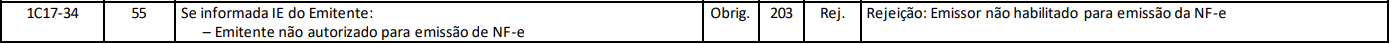 A Rejeição 203 - "Emitente não habilitado para emissão de NF-e" ocorre quando uma Nota Fiscal Eletrônica (NF-e) é emitida e o emitente não está autorizado pela SEFAZ (Secretaria da Fazenda) para emitir esse tipo de documento fiscal, ocorrerá a rejeição "203 - Emitente não habilitado para emissão de NF-e".