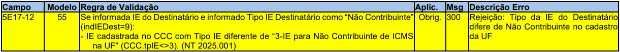 Na sua NF-e, você marcou o campo indIEDest = 9 (não contribuinte). Porém, o destinatário consta na base da SEFAZ como contribuinte, resultando na rejeição da nota com a mensagem: Rejeição 300 – Tipo da IE do destinatário difere de “não contribuinte” no cadastro da UF.