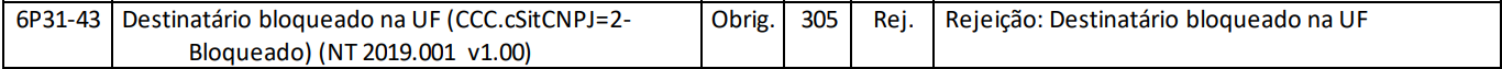 Uma empresa emite uma NF-e para um cliente em outro estado. Ao validar a nota, a SEFAZ do estado de destino verifica que o destinatário está com a inscrição estadual bloqueada e rejeita a nota com o motivo 305 – Destinatário bloqueado na UF.