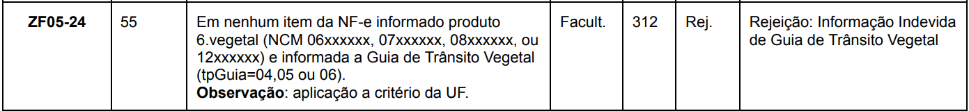 Como os produtos não são mudas, sementes ou vegetais sujeitos a controle fitossanitário, a SEFAZ retorna: Rejeição 312 – Informação Indevida de Guia de Trânsito Vegetal.