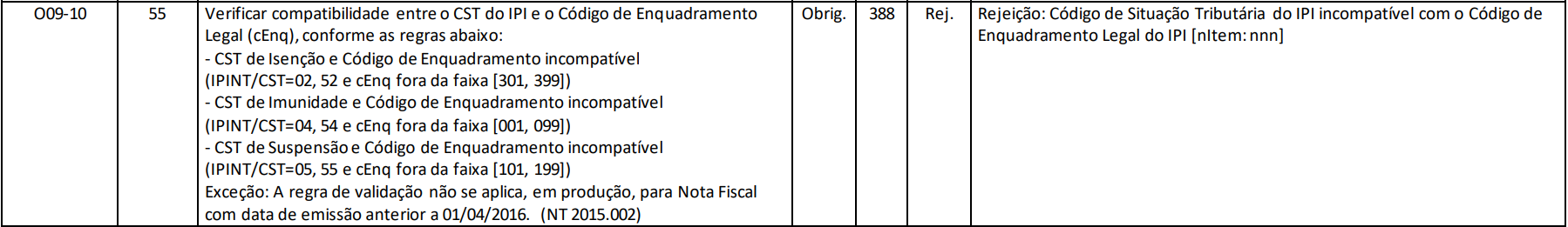 Cada CST do IPI possui restrições específicas quanto aos enquadramentos legais que podem ser utilizados, e qualquer combinação inválida entre eles faz com que a SEFAZ rejeite a nota com a mensagem: "388 – Código de Situação Tributária do IPI incompatível com o Código de Enquadramento Legal do IPI [nItem:1]".