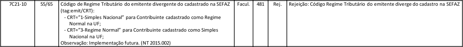 Uma nota fiscal foi emitida por um emitente que está sob o Regime Tributário Normal (CRT = 3), mas na NF-e foi informado que o emitente está sob o Regime Simples Nacional (CRT = 1). Nessa situação, a NF-e será rejeitada pelo motivo 481.