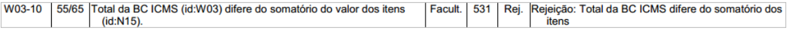 A Rejeição 531 - "Total da BC ICMS difere do somatório dos itens" ocorre quando uma Nota Fiscal Eletrônica (NF-e, modelo 55) ou Nota Fiscal de Consumidor Eletrônica (NFC-e, modelo 65) é emitida, e o total da Base de Cálculo do ICMS informado no Grupo de Totais da NF-e for diferente do somatório da Base de Cálculo dos itens, ocorrerá a rejeição "531 - Total da BC ICMS difere do somatório dos itens".