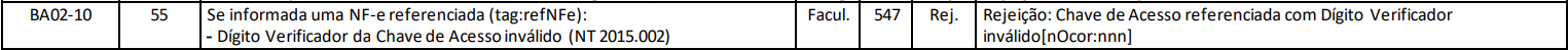 A Rejeição 547 ocorre quando a chave de acesso informada como referência em uma Nota Fiscal Eletrônica (NF-e) — geralmente usada em notas de devolução, complemento ou ajuste — possui um Dígito Verificador (DV) incorreto.