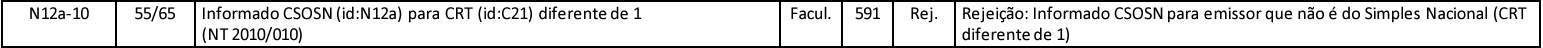 Na prática, isso significa que, em notas emitidas por empresas fora do Simples Nacional, não é permitido informar o CSOSN. Quando isso ocorre, a NF-e é rejeitada com a mensagem: "591 - Informado CSOSN para emissor que não é do Simples Nacional (CRT diferente de 1 ou 4)".