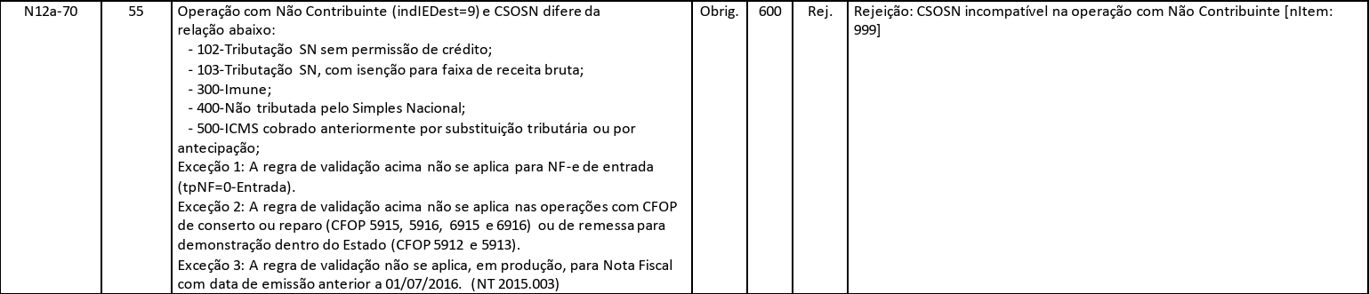 Se um CSOSN diferente desses for utilizado, a SEFAZ rejeita a NF-e com a mensagem "600 – CSOSN incompatível na operação com Não Contribuinte".
