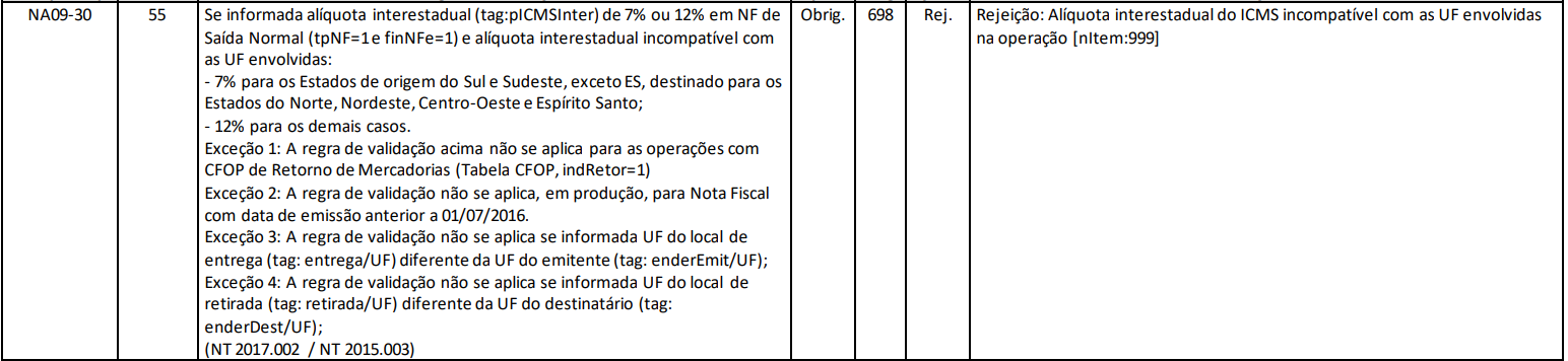 Se a alíquota usada não corresponde às regras estabelecidas para os estados envolvidos, a nota será rejeitada com o motivo 698.