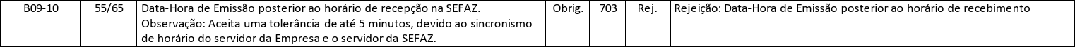 A SEFAZ aceita uma tolerância máxima de 5 minutos de diferença entre os horários dos sistemas, justamente para cobrir pequenas divergências de sincronização entre o servidor da empresa e o da SEFAZ. Se a diferença ultrapassar esse limite, a nota será rejeitada com a mensagem: 703 – Data-Hora de Emissão posterior ao horário de recebimento.