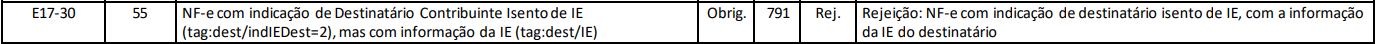 Imagine que uma NF-e foi emitida com o Indicador da IE do Destinatário configurado como "2 - Contribuinte isento de inscrição", mas o campo IE (Inscrição Estadual) do destinatário foi preenchido. Nessa situação, a NF-e será rejeitada pelo motivo 791.