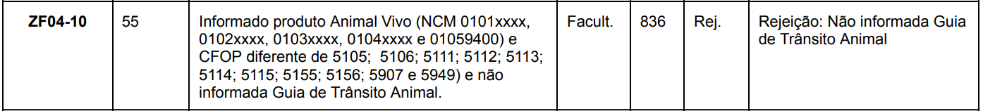 Essa rejeição ocorre quando a NF-e possui item relacionado à comercialização ou transporte de animais vivos, mas não foi informada a Guia de Trânsito Animal (GTA).