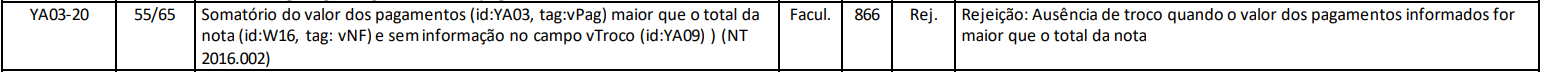 Essa rejeição acontece quando o valor informado nos meios de pagamento da nota é maior que o valor total da nota, e não foi declarado o valor do troco. A SEFAZ entende que, se o cliente pagou mais do que o total da nota, o campo de troco precisa obrigatoriamente ser preenchido.