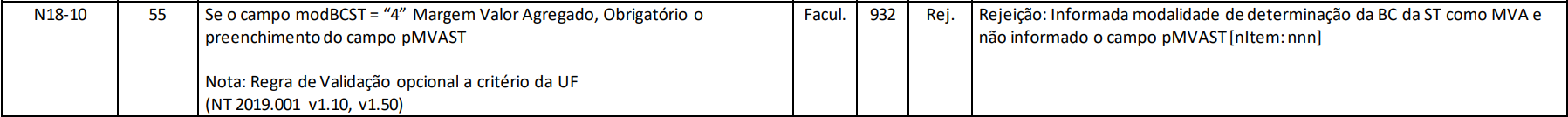 Uma empresa emite uma NF-e com ICMS-ST e seleciona como modalidade de determinação da base de cálculo a opção "0 – MVA", mas deixa o campo pMVAST em branco. Como essa informação é necessária para o cálculo do imposto, a nota é rejeitada com o motivo 932 – Informada modalidade de determinação da BC da ST como MVA e não informado o campo pMVAST.