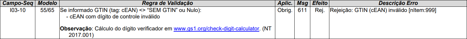 Uma empresa emite uma NF-e e, ao preencher o campo de código de barras de um produto, informa o valor 123456789. Como esse código possui 9 dígitos e o GTIN só é aceito com 8, 12, 13 ou 14 dígitos, a SEFAZ rejeita a nota com o motivo 611 – GTIN (cEAN) inválido.